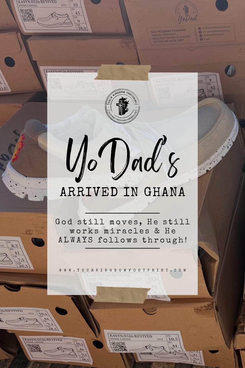 “During our recent visit to Ghana, we had the privilege of donating hundreds of shoes - each inscribed with “Your Kingdom Footprint” - which we purchased from Ryan and his wife, Chané. These shoes were distributed across non‑denominational organizations, churches, selected groups, schools, and individuals from all walks of life.